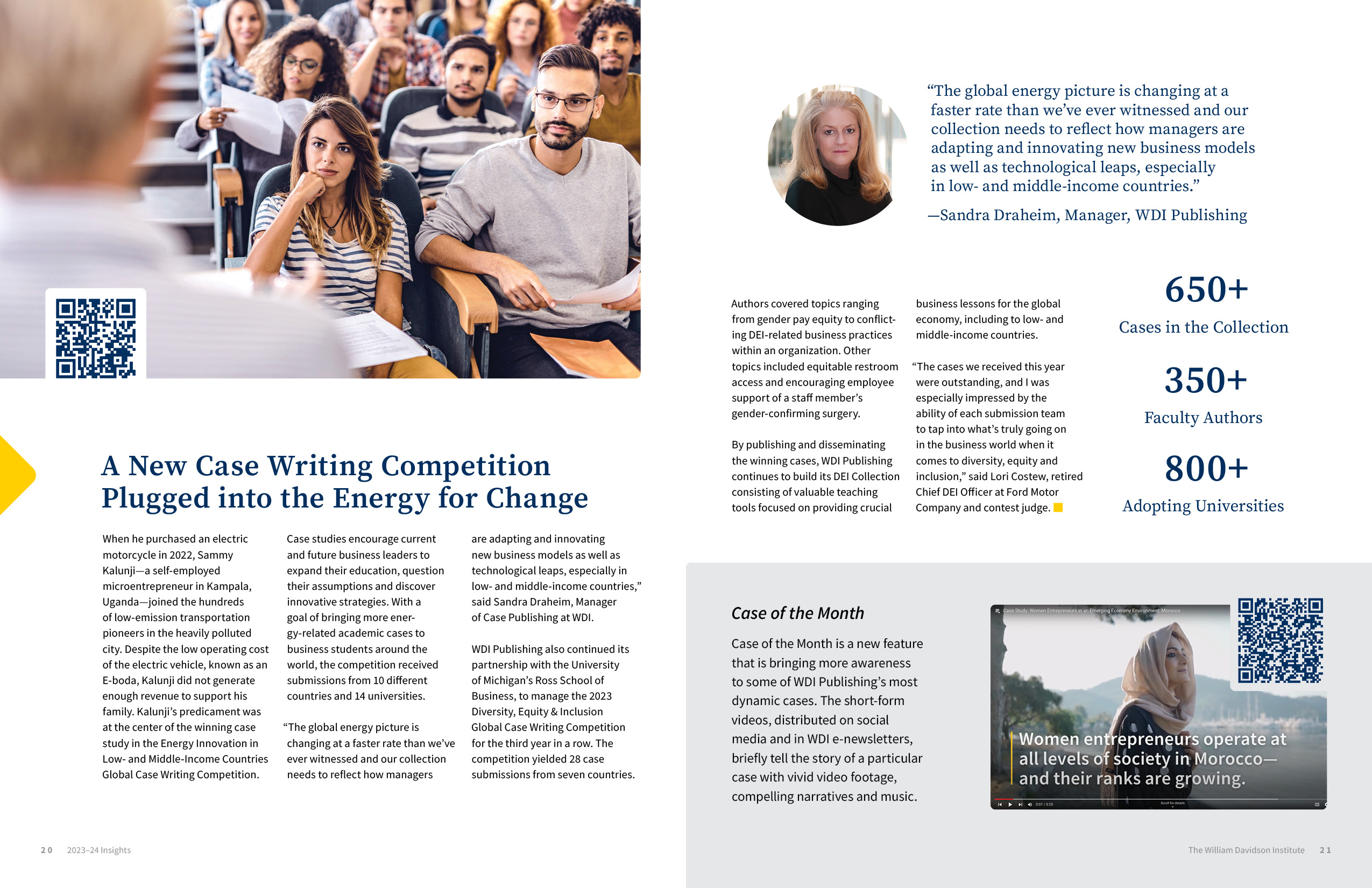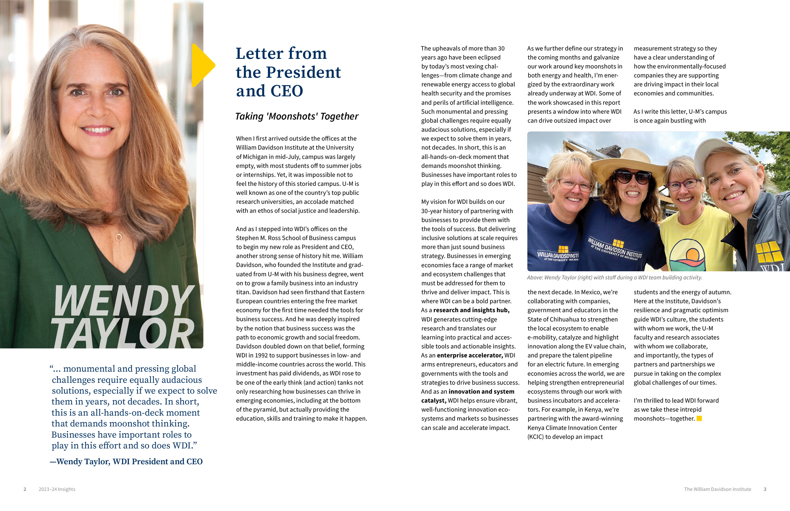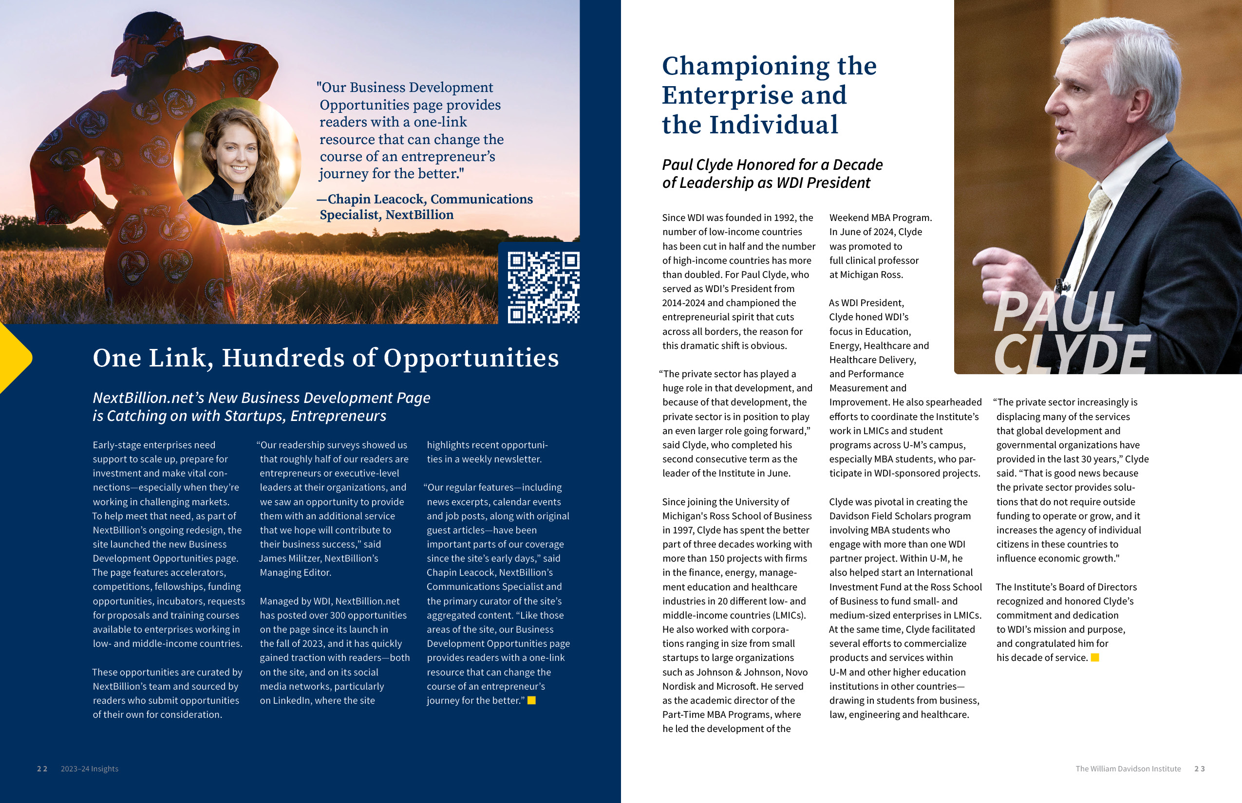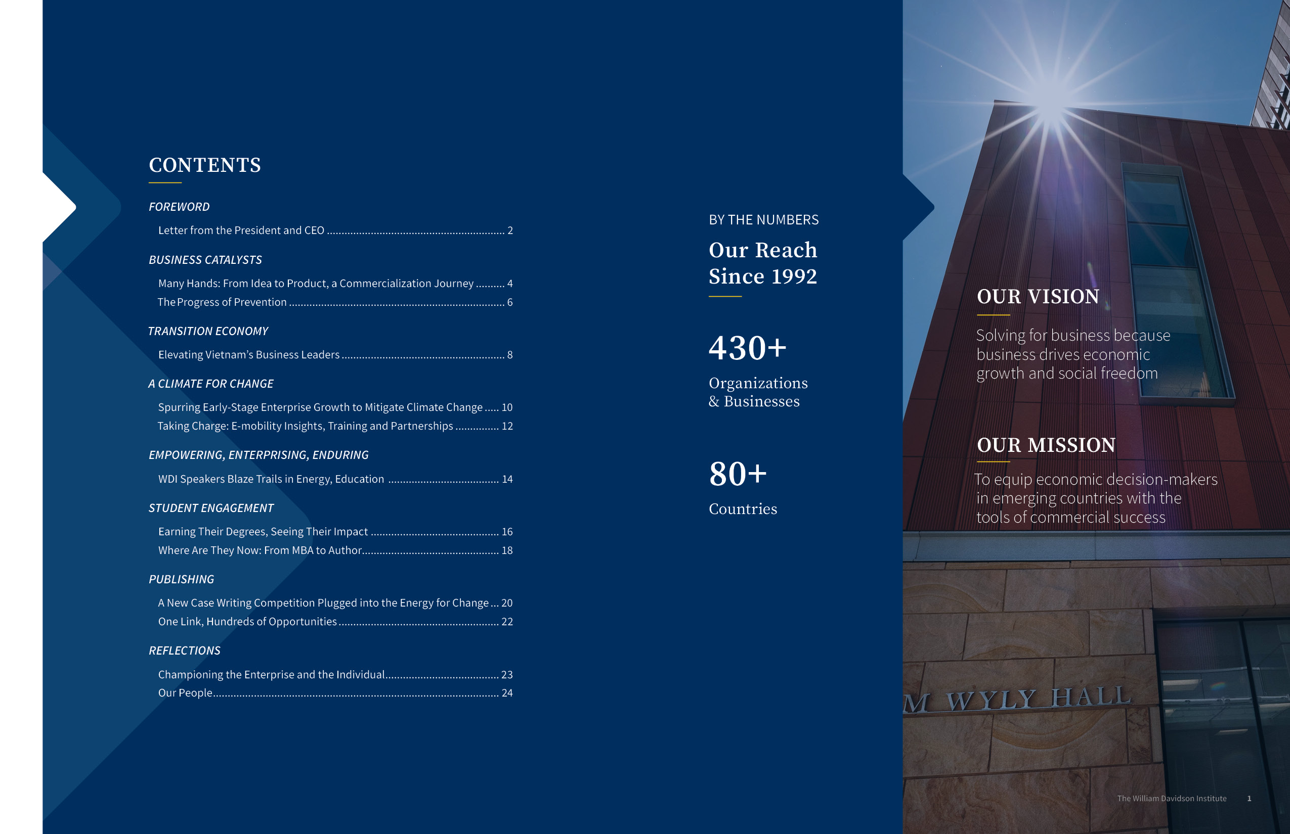 Designed for the William Davidson Institute at the University of Michigan, this 28-page annual report highlights the institute’s achievements and initiatives over the fiscal year. As the fourth and final edition in a multi-year series, the report maintained consistency in scope and structure while introducing a completely original visual direction to keep the storytelling fresh and engaging.